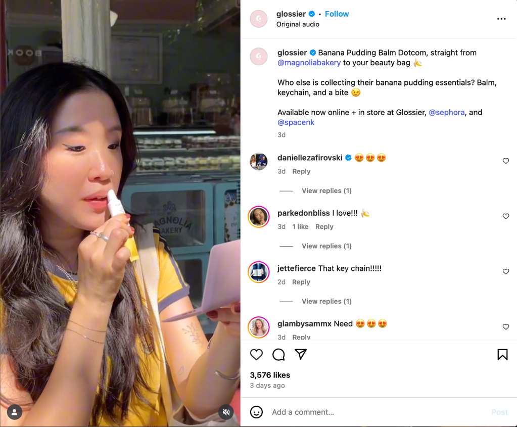 Glossier also knows how to leverage user-generated content (UGC) and micro-influencers to promote its products. As Generation Z consumers on Instagram tend to make quick purchase decisions based on contents that feels more relatable and creates a genuine connection. Meanwhile, UGC creates a sense of belonging by showcasing real consumer experiences, which can be more persuasive than traditional advertising. Glossier has clearly embraced this strategy, using micro-influencers to attract niche followers who value authenticity and trustworthiness in online content. These personal stories often resonate more deeply with potential buyers, influencing their purchasing decisions. Finally, encouraging UGC in digital marketing strategies can be a cost-effective way to save budget but also create more content to reach wider customer segments.